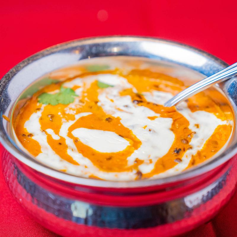 Urad daal (black lentils) cooked with onions, garlic, ginger, tomatoes, and spices in a thick sauce.